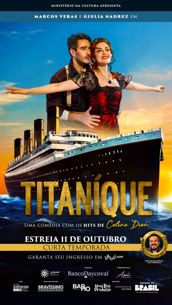 Uma comédia hilária e irreverente do clássico Titanic (1997), Titanique — O Musical está repleto de reviravoltas absurdas e canções icônicas que elevam a experiência a algo verdadeiramente inesquecível. O espetáculo é uma carta de amor à música pop, ao cinema e ao teatro musical — prometendo uma noite cheia de risadas, emoção e pura alegria, tudo ao som inesquecível de Céline Dion.Marla Mindelle, Constantine Rousouli e Tye Blue | Direção artística: Gustavo Barchilon | Elenco: Alessandra Maestrini, Marcos Veras, Giulia Nadruz, Luis Lobianco, George Sauma, Wendell Bendelack, Valéria Barcellos, Talita Real, Matheus Ribeiro, Luiza Lapa, Marcos Lanza e Luan Carvalho | Direção de produção: Thiago Hofman | Assistência de direção: Talita Real e Gabi Camisotti | Coreografia: Alonso Barros | Direção musical e Arranjos: Thiago Gimenes | Figurino: Theodoro Cochrane | Assistência de figurino: Marcos Valadão | Desenho de Luz: Maneco Quinderé | Visagismo: Feliciano San Roman | Cenografia: Natália Lana | Design de som: João Baracho | Direção Residente: Talita Real | Versão Brasileira: Gustavo Barchilon | Coordenação de Produção: Nina Dutra | Produção: Nina Dutra, Juliana Brigido e Arthur Maia | Fotógrafo: Caio Galucci | Chefe de Palco: Almir Rocha | Stage Manager: Victor Ribeiro | Técnicos de Palco: Wesley Nenê e Alex Sandro | Músicos: Jhonny Mantelato, Ramiz Oliveira, Evandro Moiss e Tiago Saul.